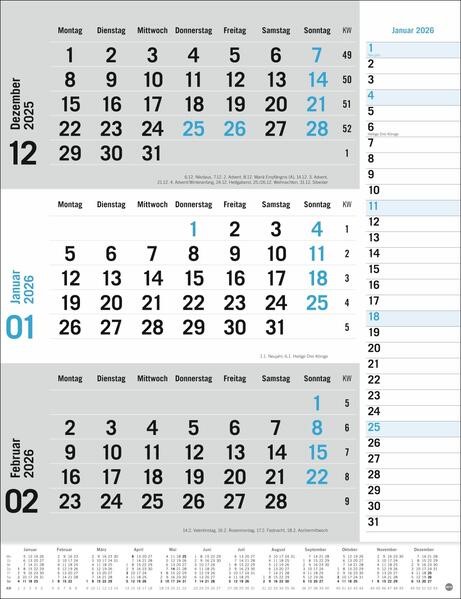 Organisationshilfe für Büro und Homeoffice mit farblich abgesetzten Wochenenden und Feiertagen in Blau