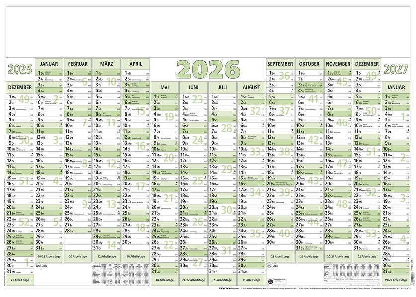 - Format & Umfang: 88 × 63 cm, 14 Monate auf einer Seite (Dezember 2025 bis Januar 2027)