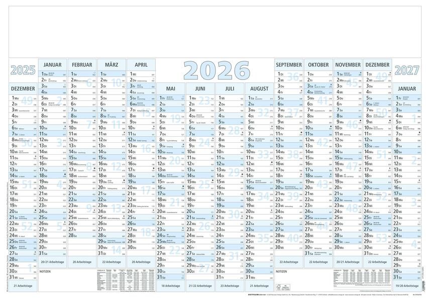 Der Zettler Plakatkalender 14 Monate 2026 bietet eine komplette Übersicht von Dezember 2025 bis Januar 2027 auf nur einer Seite. Im Großformat von 100 × 70 cm eignet er sich perfekt für die Jahresplanung im Büro, in der Praxis oder im Homeoffice.